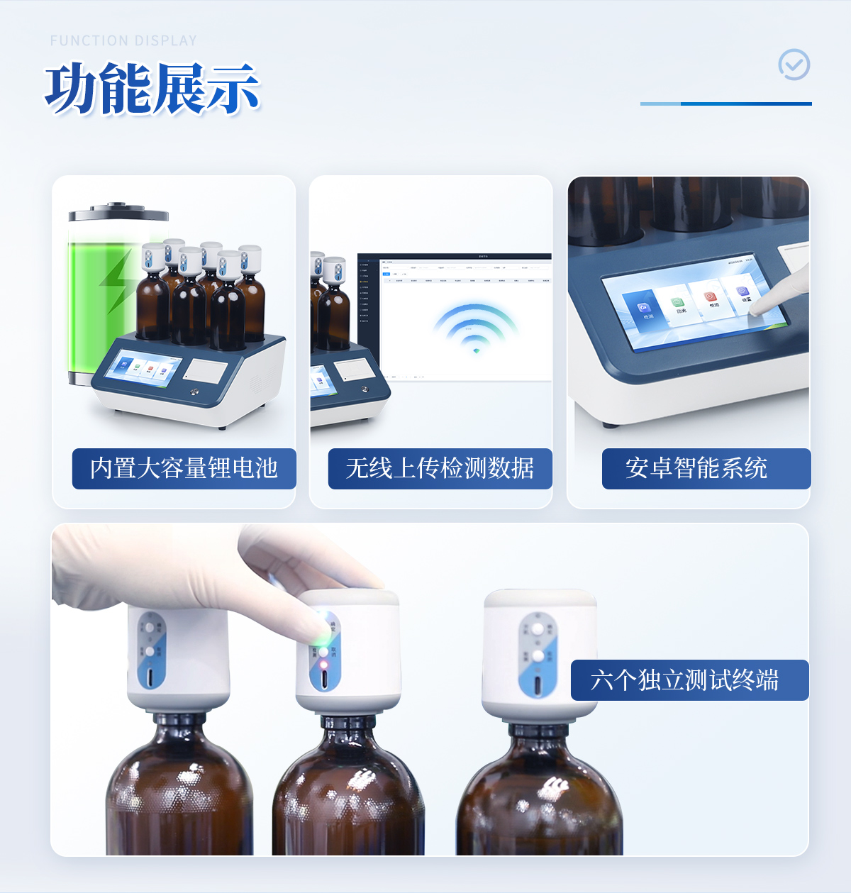 1、采用****的无汞压差法,无汞污染,且数据准确可靠; 2、6个测试终端,独立控制,在检测过程中可随时加入新的测量组; 3、Android系统,操作交互性体验更好,更加简便快捷; 4、7英寸液晶触摸屏,人性化设计的人机交互,所有数值对比显示,简单直观; 5、无需人工换算,仪器可直接显示BOD浓度值,多组数据可在统一界面显示; 6、仪器可自动分析并绘制出测定水样的数据曲线,多组曲线可在统一界面显示; 7、测试终端与主机通过蓝牙连接,将数据无线传输到主机显示。 8、每个测试终端内置大容量锂电池,电池寿命2年以上,短暂停电对测试无影响; 9、底座集成了6个USB插口,可以直接用来给测试终端充电,充满电使用长达半年以上。 10、实验环节无管路设计,避免管路老化、漏气等弊端; 11、测量范围可选择,在水样浓度低于4000g/L时,无需稀释; 12、测定仪自动记录测量数据,时间记录频率任意设置,检测数据更**; 13、培养时间可根据需求灵活调整,*长可达30天; 14、自动完成测量过程,无需专人值守; 15、内置热敏打印机,可自动打印测定前所设置参数,并且可自由取消不需要打印的内容; 16、内置时钟系统,实时显示时间,并可按时间查询测量数据; 17、仪器带有云平台,可通过WIFI无线上传检测数据,通过电脑或手机登录后查看、统计、分析数据更清晰。 18、仪器内置操作步骤演示视频,用户观看仪器内视频进行学习,上手更快速。