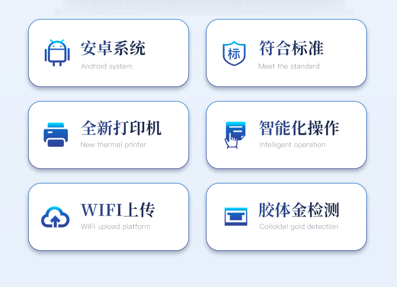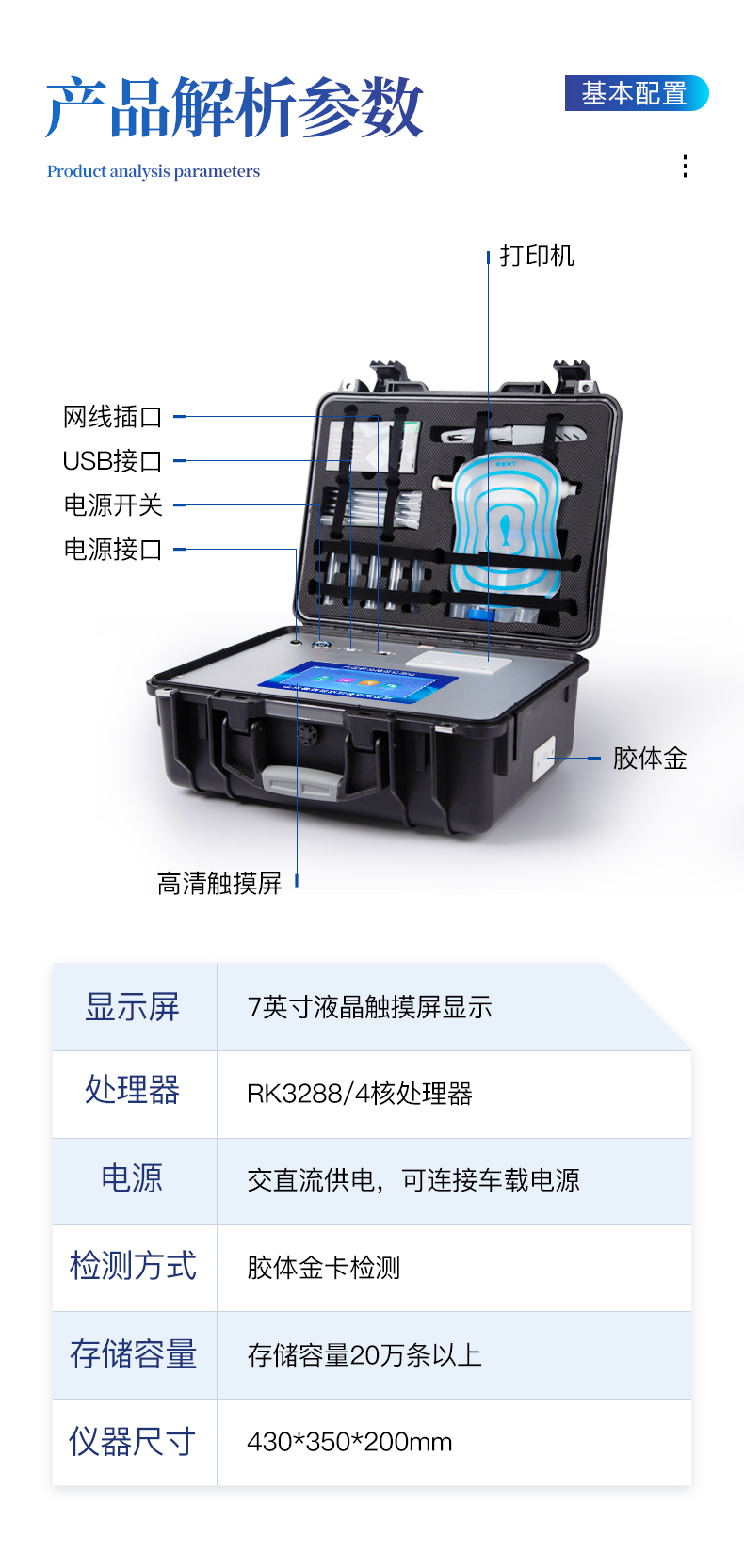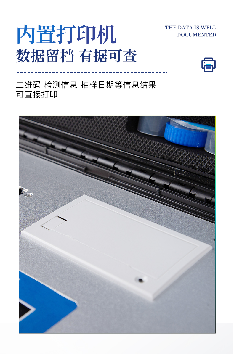 | 胶体金模块检测方式:轨道式自动传输扫描,检测完成后自动退出试纸。 | ◆ CT线自动识别,无需手动调整。 | ◆ 样品处理简单省力,整体操作快速、安全、便捷。 | ◆ 高灵敏度,高检测精度,高重复性精度,扫描式高精度光学传感器。 | ◆ 内置强大的数据库,可在仪器上直接选择样品名称、检测指标、送检单位等信息,也可在仪器上直接编辑录入样品名称、检测指标、送检单位等信息并保存进样品数据库。 | ◆ 兼容市场上所有的胶体金卡,使用耗材不受限制,极大增强用户使用体验。 | 主要参数:1、主控芯片采用32位处理器,运转速度更快,稳定性强。 | 显示方式:7英寸液晶触摸屏显示,人性化中文操作界面,读数直观、简单。 | ◆ 直流12V供电,可连接车载电源。4、脉冲式恒流驱动,避免连续发光引起光衰和温漂。5、内置*新国家限量标准,可继续更新。6、可设置密码登录7、不间断进样,连续检测8、样本编号自动累加。9、检测项目可扩充。10、检测结果可批量打印,批量上传。11、检测结果为Excel表格,连接电脑即可拷贝。12、检测结果存储容量20万条13、支持Wifi网络,数据可局域网和互联网数据上传,检测结果直接传至食品安全监管平台。进行区域食品安全监管及大数据分析处理,检测区域食品安全长短期动态,达到食品安全问题预估、预警14、高速热敏打印机,检测完成可自动打印检测报告。15、标准USB接口,免驱动安装。 | ◆ 固件可升级 | 仪器包装尺寸:550*245*375mm,包装重量:6.8kg |