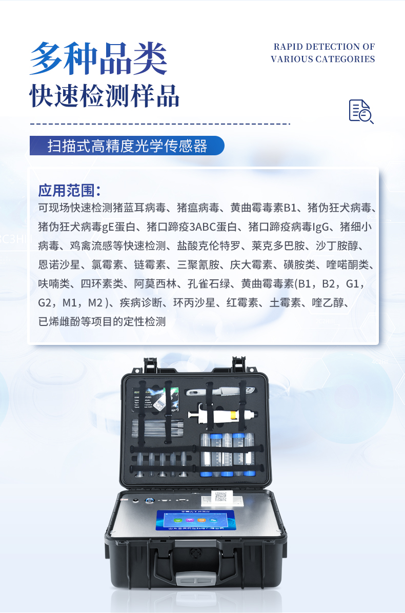 该动物疫病诊断仪适用于猪、鸡、鸭、羊、牛、牛奶等畜禽产品中动物疫病、兽药残留、有毒有害物质和抗生素残留的检测可广泛应用于食药监局、卫生部门、高教院校、科研院所、农业部门、畜牧兽医、养殖场、屠宰场、食品肉产品深加工企业、检验检疫部门等单位使用。