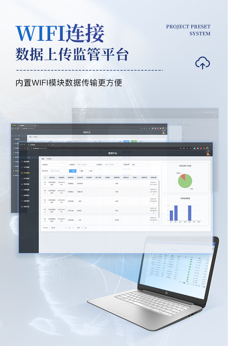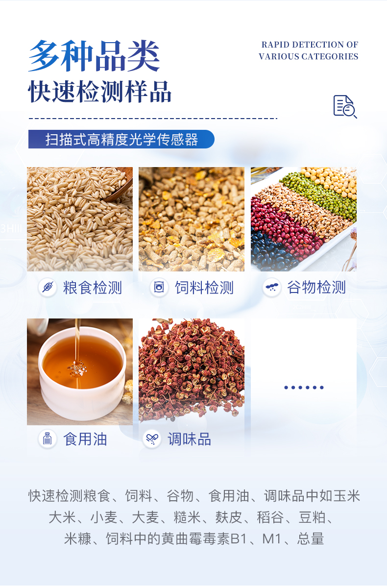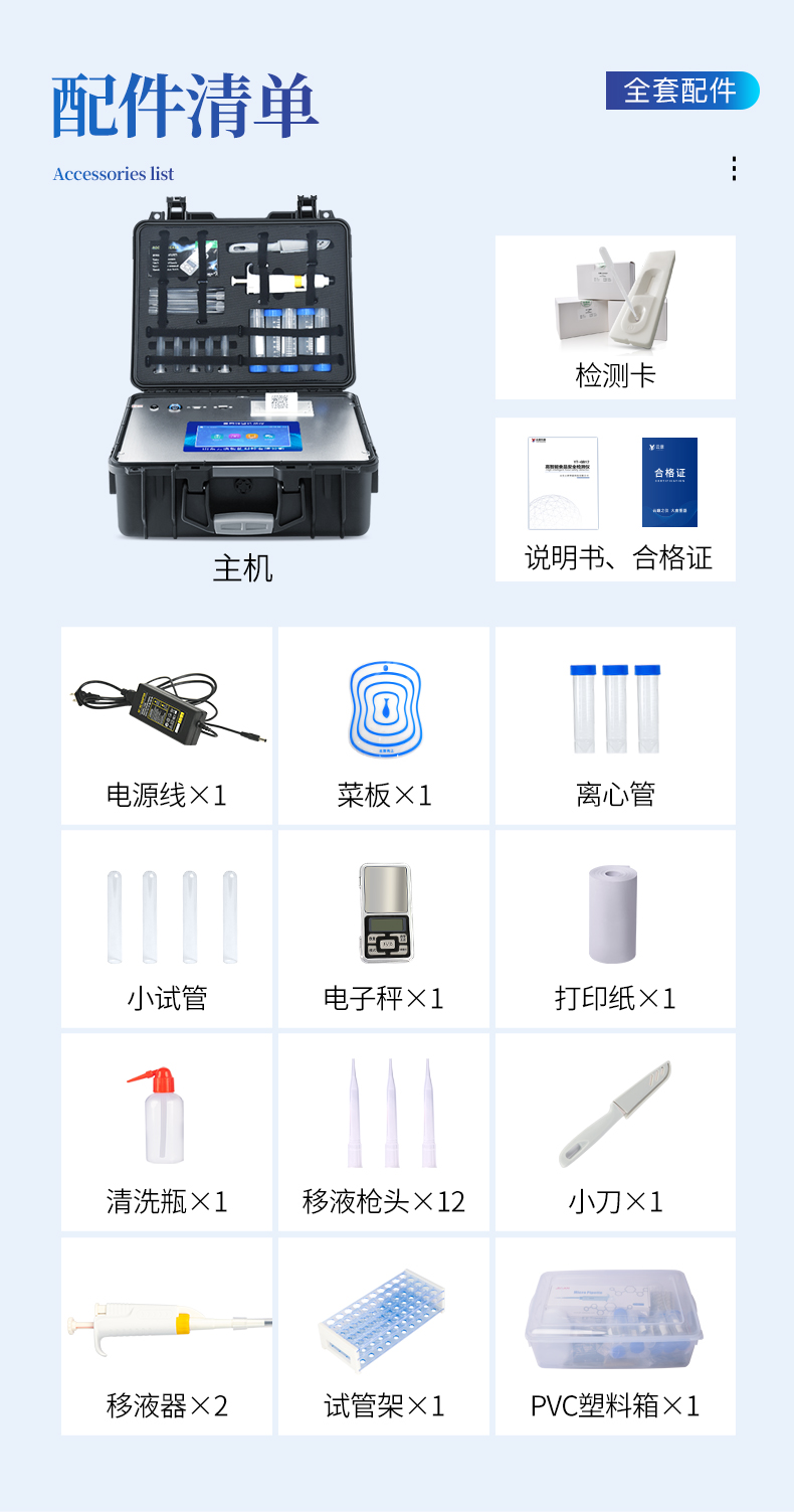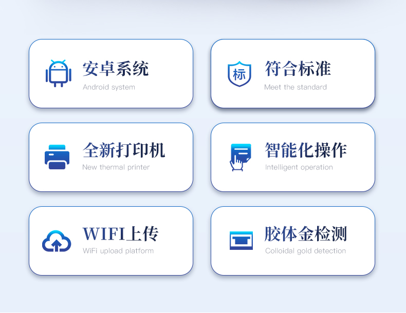| ◆ 安卓智能操作系统,采用更加**和人性化操作,仪器具有网线连接、wifi联网上传、GPRS无线远传功能,快速上传数据。 | 智能化程度高,仪器具有自检功能:具有开机自检和调零功能,具有自动检测重复性功能。 | ◆ 新一代高速热敏打印机,检测完成可自动打印检测报告和二维码。 | ◆ 仪器带有监管平台,数据可局域网和互联网数据上传,检测结果直接传至食品安全监管平台。进行区域食品安全监管及大数据分析处理与数据统计,检测区域食品安全长短期动态,达到食品安全问题预估、预警 | ◆ 一体化主机,包含食品安全检测模块、多通道农药残留检测模块、胶体金免疫层析检测模块。 | ◆ 一体化便携式快检设备,满足现场及流动检测使用需求,能够在同一软件下实现所有检测项目的检测,并可通过同一窗口直观显示检测结果。 | 胶体金模块检测方式:轨道式自动传输扫描,检测完成后自动退出检测卡。 | ◆ CT线自动识别,无需手动调整。 | ◆ 仪器具有品类多种类样品菜单库,可灵活选择检测样品,不同的检测通道可同时检测不同的样品项目。 | ◆ 样品处理简单省力,整体操作快速、安全、便捷。 | ◆ 仪器具有自身保护功能,可设置用户名及密码,防止非工作人员操作等。 | ◆ 高灵敏度,高检测精度,高重复性精度,扫描式高精度光学传感器。 | ◆ 内置强大的数据库,可在仪器上直接选择样品名称、检测指标、送检单位等信息,也可在仪器上直接编辑录入样品名称、检测指标、送检单位等信息并保存进样品数据库。 | ◆ 仪器具有重新校准、锁定、恢复出厂设置功能。 | ◆ 结果判定线可修改,对照值标定值可保存,断电不丢失数据。 | ◆ 兼容市场上所有的胶体金卡,使用耗材不受限制,极大增强用户使用体验。 |