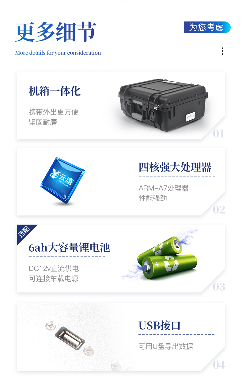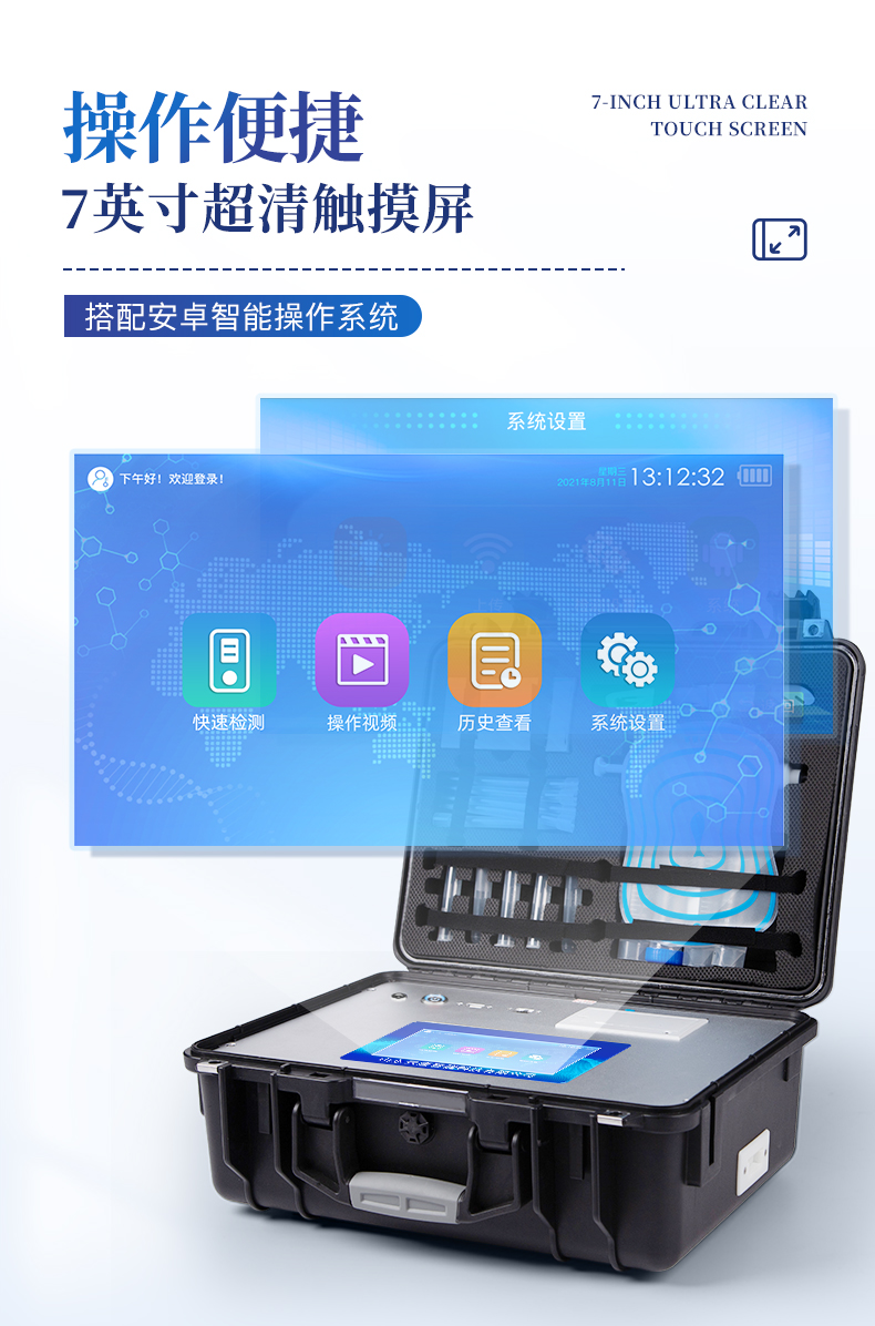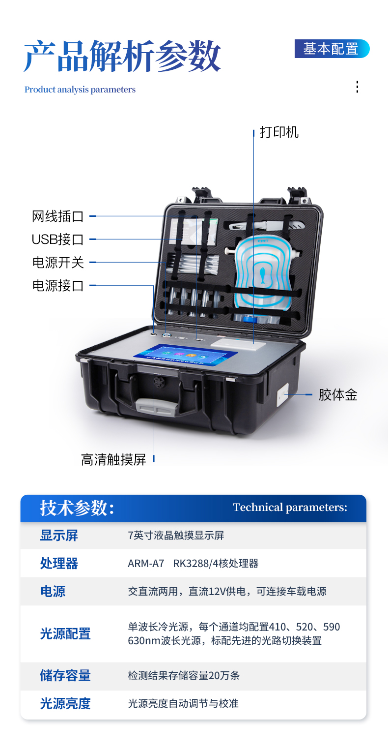 | ◆ 主控芯片采用ARM Cortex-A7,RK3288/4核处理器,主频1.88Ghz,运转速度更快速,稳定性更强。 | 显示方式:7英寸液晶触摸屏显示,人性化中文操作界面,读数直观、简单。 | ◆ 交直流两用,直流12V供电,可连接车载电源,可配6ah大容量充电锂电池,方便户外流动测试。 | ◆ 光源亮度自动调节与校准 | ◆ 智能恒流稳压,光强自动校准,长时间连续工作光源无温漂现象。。 | ◆ 内置新国家限量标准,与所测结果进行现场比对,并持续更新标准。 | ◆ 不间断进样,连续检测 | ◆ 样本编号自动累加。 | ◆ 检测项目可扩充。 | ◆ 检测结果可批量打印,批量上传。 | ◆ 检测结果为Excel表格,连接电脑即可拷贝。 | ◆ 检测结果存储容量20万条 | ◆ 支持U盘存储,标准USB接口,免驱动安装。 | ◆ 固件可升级 |