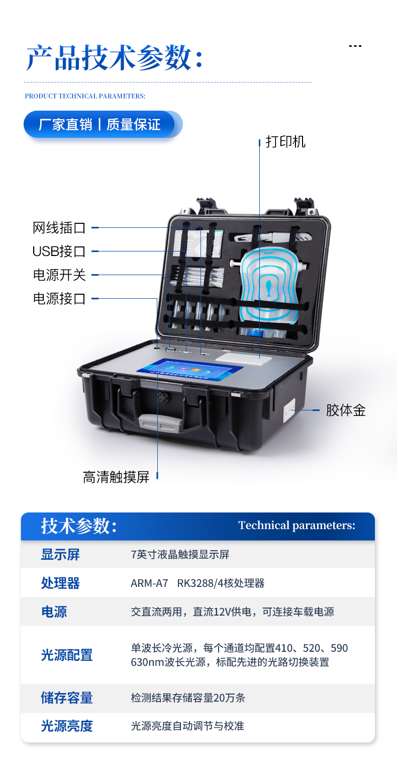| 主控芯片采用ARM Cortex-A7,RK3288/4核处理器,主频1.88Ghz,运转速度更快速,稳定性更强。 | 显示方式:7英寸液晶触摸屏显示,人性化中文操作界面,读数直观、简单。 | 交直流两用,直流12V供电,可连接车载电源,可配6ah大容量充电锂电池,方便户外流动测试。 | 光源亮度自动调节与校准 | 智能恒流稳压,光强自动校准,长时间连续工作光源无温漂现象。 | 内置新国家限量标准,与所测结果进行现场比对,并持续更新标准。 | 不间断进样,连续检测 | 样本编号自动累加。 | 检测项目可扩充。 | 检测结果可批量打印,批量上传。 | 检测结果为Excel表格,连接电脑即可拷贝 | 检测结果存储容量20万条 | 标准USB接口,免驱动安装。 | 固件可升级 |