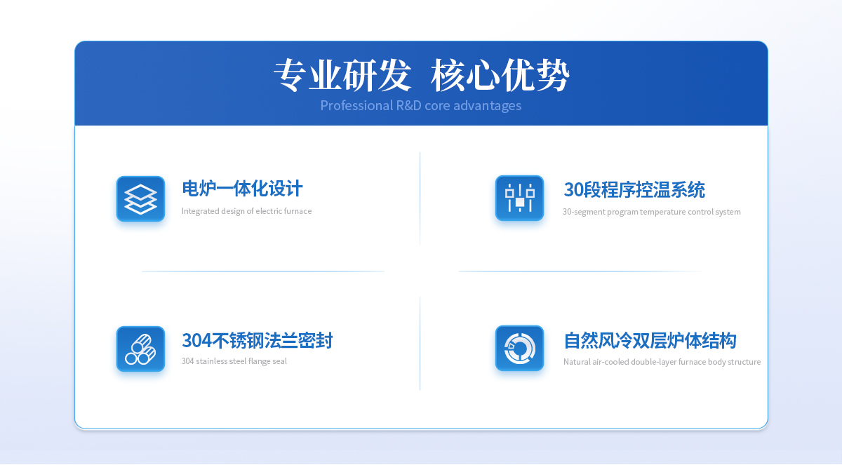 1、炉膛采用优质氧化铝纤维材料,保温性能好,耐用,拉伸强度高,无杂球,纯度高,节能效果明显; | 2、加热元件采用优质HRE电阻丝,大大提高了其使用寿命; | 3、超温报警,漏电保护,操作安全可靠。 |