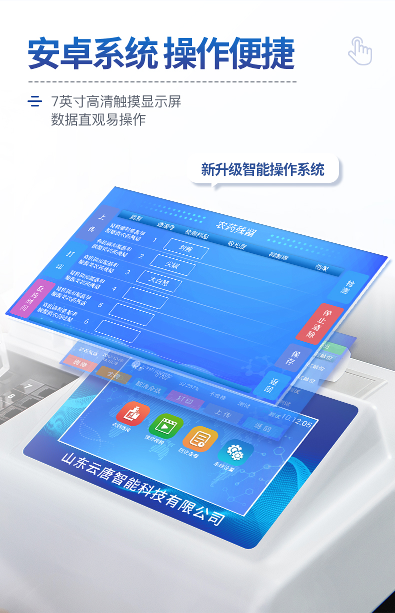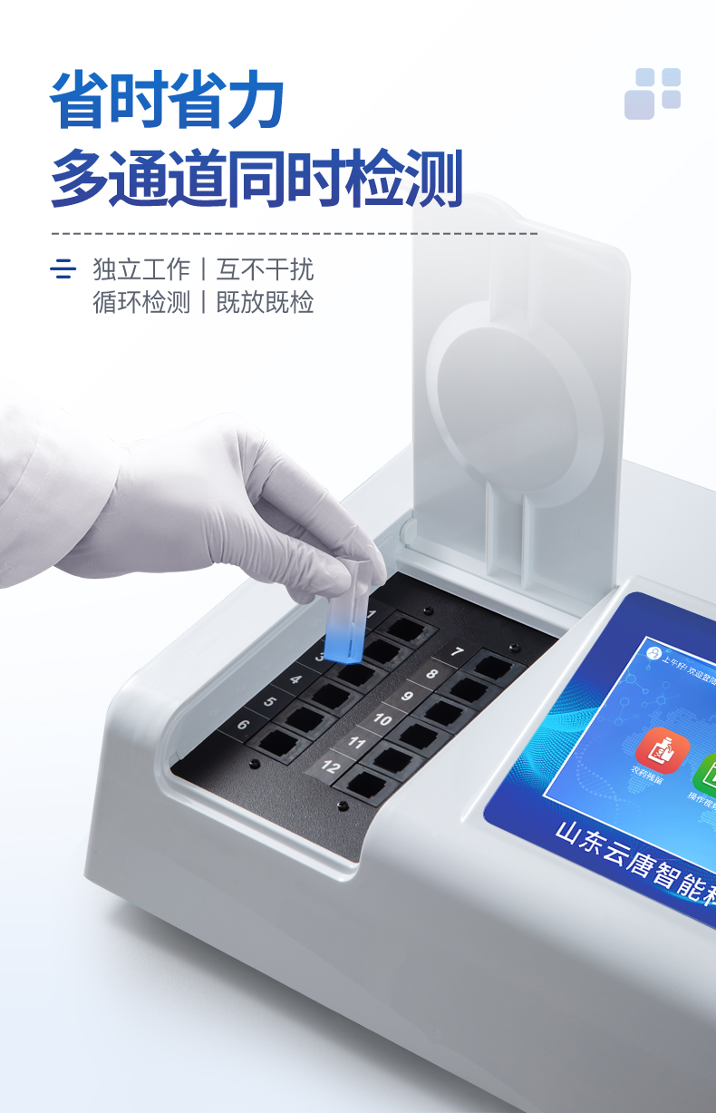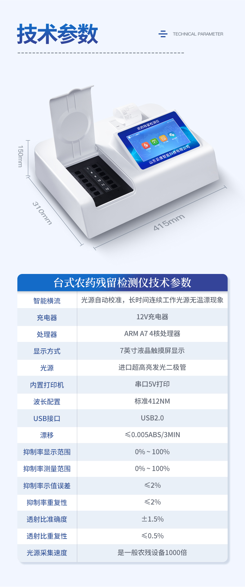 | ◆ 乙酰胆碱酯酶和丁酰胆碱酯酶试剂均可以使用,符合国家标准和农业部标准的要求。 | ◆ 自动判断样品是否合格,检测结果更加直观。 | ◆ 仪器具有100多种蔬菜名称菜单库,分类管理,并可按需添加或删除蔬菜名,编辑蔬菜名称,可直接打印出蔬菜名称。 | 检测通道:8个检测通道,可以同时测试多个样品,循环检测,即放即检,每个样品由程序控制分别独立工作,不会互相干扰。 | 显示方式:7英寸高灵敏真彩触摸屏显示,人性化中文操作界面,读数直观、简单。 | ◆ 打印机采用串口5v打印,可选择手动打印或者自动打印,三分钟出打印结果,打印格式为检测人姓名、吸光度差值、检测时间、检测机构、样品名称及结果判定。 | ◆ 光源采用进口超高亮发光二极管,具有低功耗、高精度、稳定性强、光源可控可以关掉不使用的光源,响应速度快等优点。 | ◆ 智能恒流稳压,光强自动校准,长时间连续工作光源无温漂现象。 | ◆ 数据可通过USB接口直接导出,方便数据的存贮和移动。 | 智能化程度高,仪器具有自检功能:具有开机自检和调零功能,具有自动检测重复性功能。 | ◆ 采用DC12v直流供电,安全系统更高,并且配备6A锂电池充电器。 | ◆ 仪器具有重新校准、锁定、恢复出厂设置功能。 |