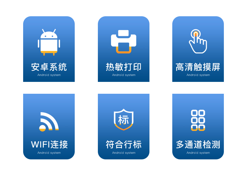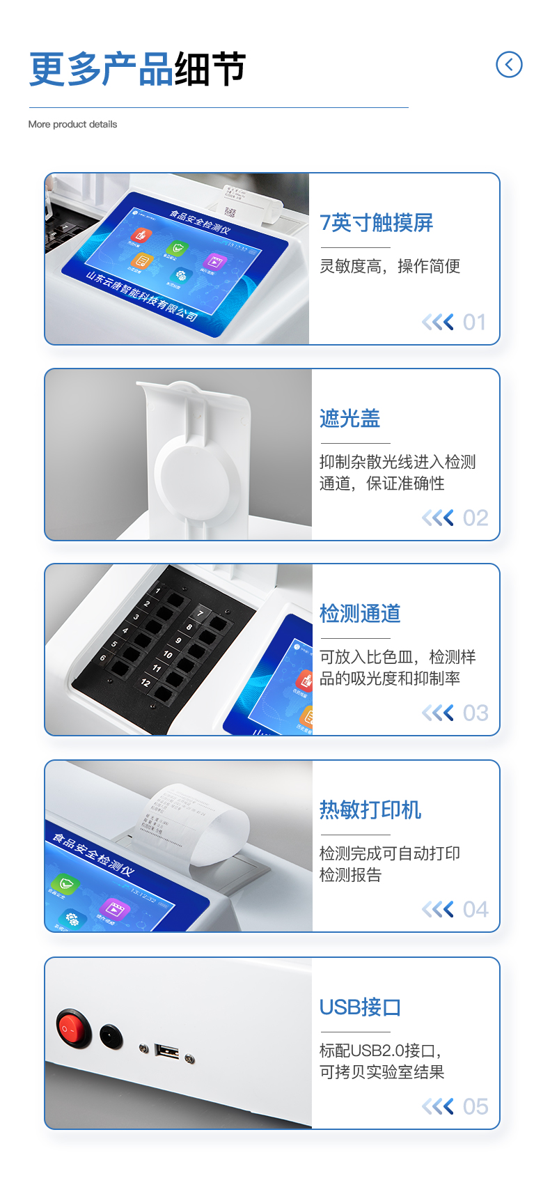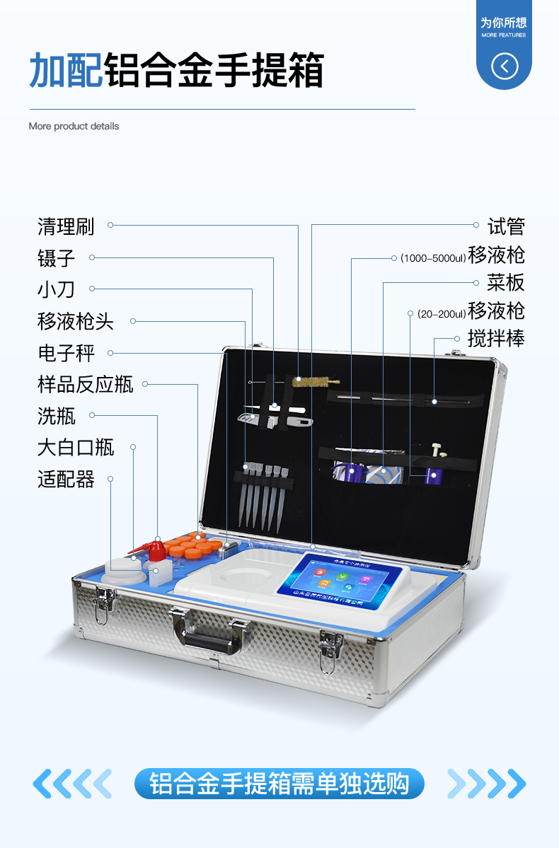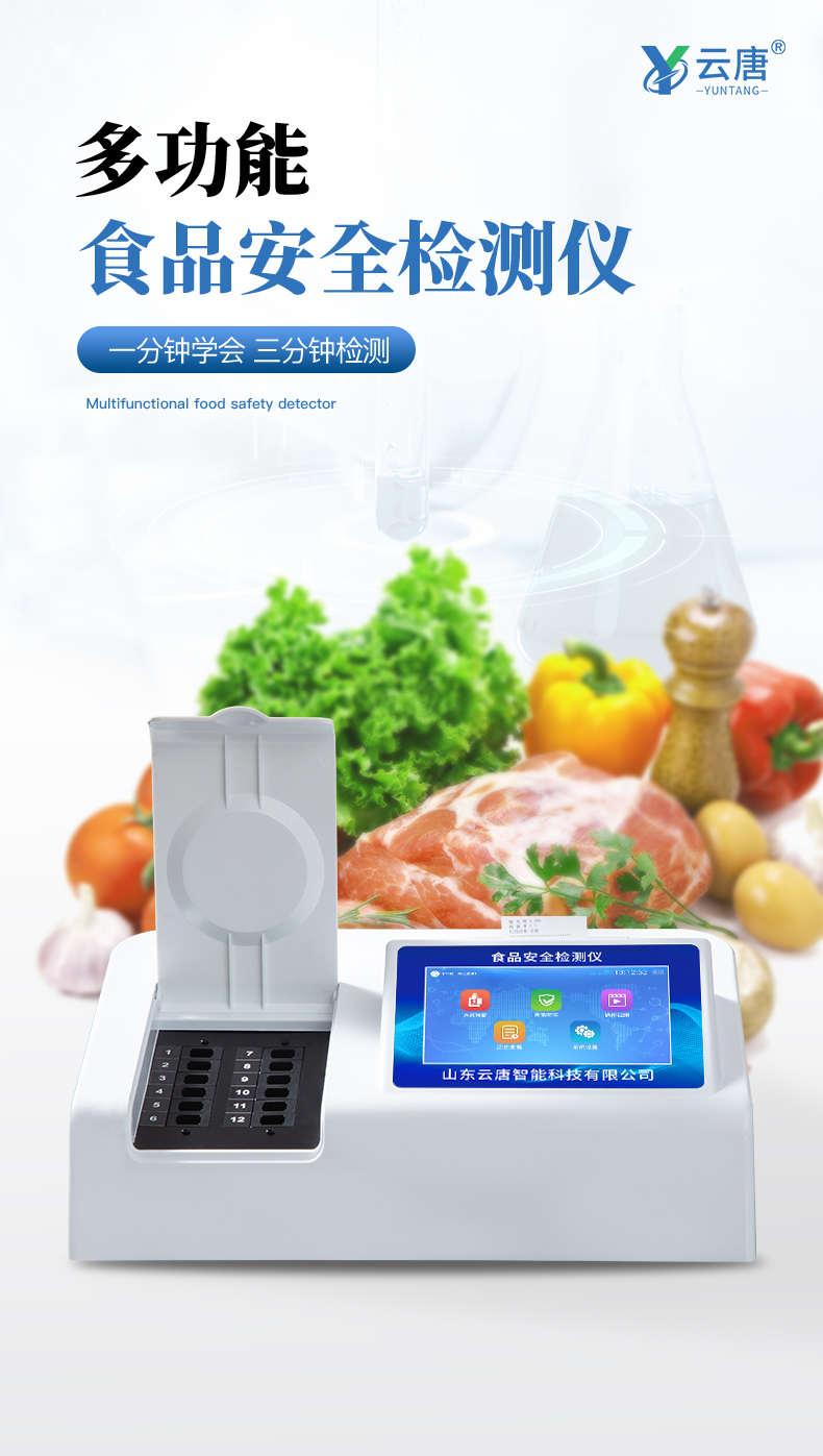 | ◆ 安卓智能操作系统,采用更加**和人性化操作,仪器具有网线连接、wifi联网上传、GPRS无线远传功能,快速上传数据。 | 智能化程度高,仪器具有自检功能:具有开机自检和调零功能,具有自动检测重复性功能。 | 检测通道:≥12个检测通道,可以同时测试多个样品,每个样品由程序控制分别独立工作,不会互相干扰。 | 显示方式:7英寸液晶触摸屏显示,人性化中文操作界面,读数直观、简单。 | ◆ 配备新一代嵌入式热敏打印机,可选择手动打印或者自动打印,检测完成可自动打印检测报告和二维码。 | ◆ 光源采用进口超高亮发光二极管,高精度、稳定性强、光源可控、可以关掉不使用的光源,功耗更低。 | ◆ 采用USB2.0接口设计,方便数据的存贮和移动,并可随时与计算机直接相连,并且可用计算机控制仪器。实现数据查询、浏览、分析、统计、打印等。 | ◆ 仪器带有监管平台。数据可局域网和互联网数据上传,检测结果直接传至食品安全监管平台。进行区域食品安全监管及大数据分析处理,检测区域食品安全长短期动态,达到食品安全问题预估、预警 | ◆ 一体化便携式快检设备,满足现场及流动检测使用需求,能够在同一软件下实现所有检测项目的检测,并可通过同一窗口直观显示检测结果。 | ◆ 仪器具有多品类多种类样品菜单库,可灵活选择检测样品,不同的检测通道可同时检测不同的样品项目。也可在仪器上直接编辑录入样品名称、检测指标、送检单位等信息并保存进样品数据库。 | ◆ 样品处理简单省力,整体操作快速、安全、便捷。 | ◆ 仪器具有自身保护功能,可设置用户名及密码,防止非工作人员操作等。 | ◆ 高灵敏度,高检测精度,高重复性精度,扫描式高精度光学传感器。 | ◆ 仪器具有重新校准、锁定、恢复出厂设置功能。 | ◆ 结果判定线可修改,对照值标定值可保存,断电不丢失数据。 |