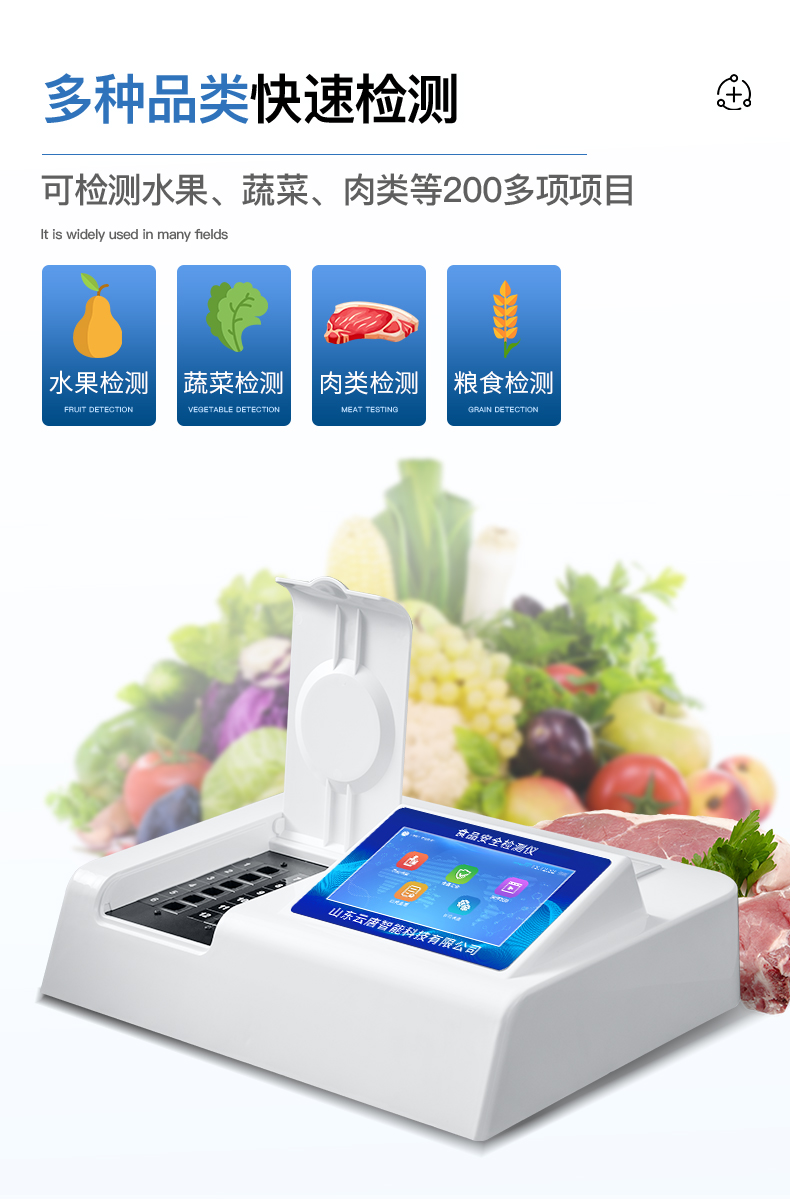 多功能食品安全检测仪可快速检测60多项目,包含:滥用食品添加剂、非食用化学物质、农药残留、重金属含量、病害肉成分、营养强化剂、化学类残留、食用油脂检测、水酒饮品分析、调味品成分、食用色素等现场的定性定量检测。