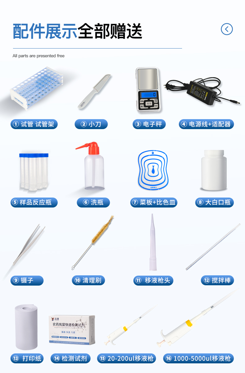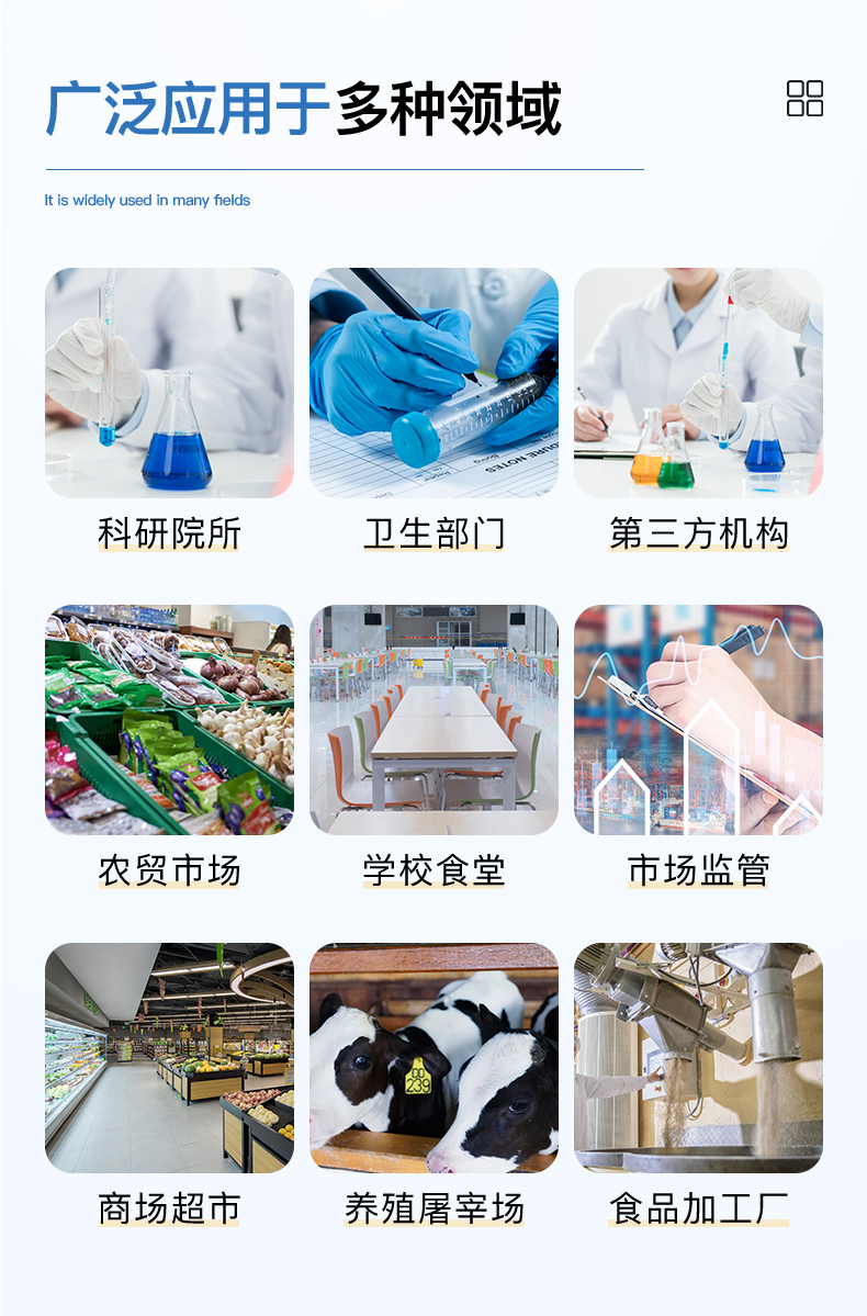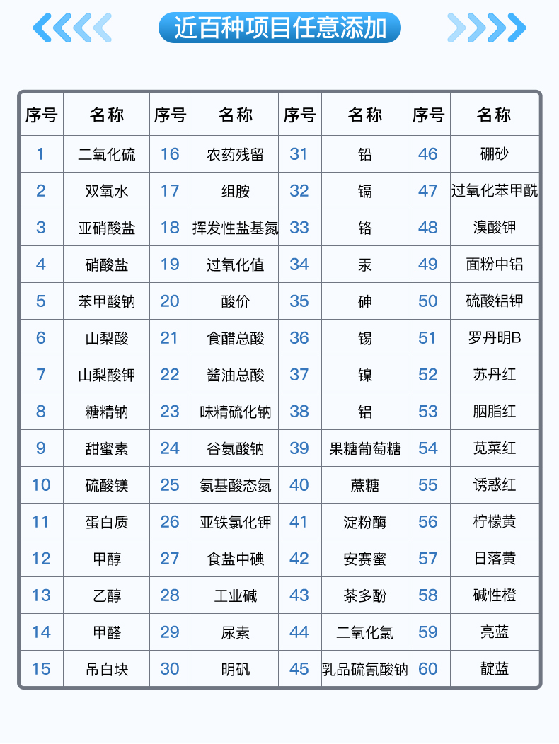 | 食品添加剂:亚硝酸盐、二氧化硫、双氧水、硝酸盐、苯甲酸钠、山梨酸、糖精钠、甜蜜素、硫酸镁 | 有毒有害物质:甲醛、吊白块、硼砂、过氧化苯甲酰、工业碱、溴酸钾、罗丹明B、三聚氰胺、苏丹红 | 果蔬中:农药残留,病害肉诊断:组胺、挥发性盐基氮、肉制品酸价、水发产品中组胺 | 重金属含量:铅、镉、铬、汞、砷、锡、镍、铝。 | 食用油脂检测:过氧化值、酸价、油脂丙二醛、总多酚。 | 水酒饮品分析:乳品及牛奶中蛋白质,酒中甲醇、乙醇、杂醇油,蜂蜜中果糖和葡萄糖、蔗糖、淀粉酶、酸度,水中氰化物、余氯,饮料中维C | 调味品成分:食醋的总酸、酱油的总酸、芝麻油纯度、谷氨酸钠、酱油氨基酸态氮、食盐中亚铁氰化钾、食盐中碘 | 食用色素类:红色色素(胭脂红、苋菜红、赤藓红)、黄色色素(柠檬黄、日落黄)、蓝色色素(亮蓝) |