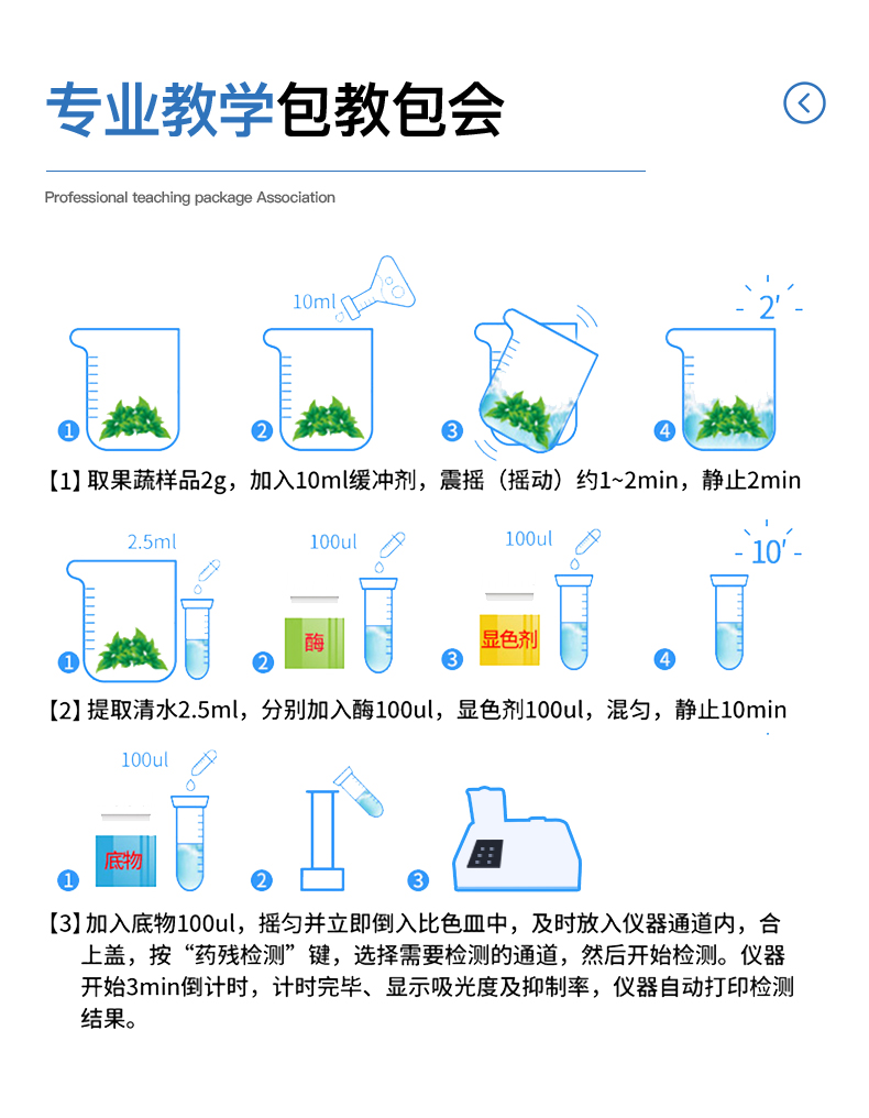 | 农 残:检出下限:抑制率 5% ,检测范围:抑制率(0~100)% | 甲 醛:检出下限:1mg/kg ,检测范围:(0~100) mg/kg | 亚硝酸盐:检出下限:1mg/kg ,检测范围:(0~100) mg/kg | 二氧化硫:检出下限:1mg/kg;5mg/kg ,检测范围:(0~100) mg/kg;(0~500) mg/kg | 吊 白 块:检出下限:5 mg/kg ,检测范围:(0~500) mg/kg | 蛋 白 质:检出下限:0.5% ,检测范围:(0~50)% | 硼 砂:检出下限:5 mg/kg ,检测范围:(0~100) mg/kg | 双 氧 水:检出下限:5 mg/kg;10 mg/kg;100 mg/kg ,检测范围: (0~500) mg/kg; (0~1000) mg/kg;(0~10000) mg/kg | 硝 酸 盐:检出下限:10 mg/kg;40 mg/kg ,检测范围: (0~1000) mg/kg; (0~4000) mg/kg | 重金属铅:检出下限:0.5 mg/kg;0.2 mg/L ,检测范围:(0~50) mg/kg;(0~20) mg/L |