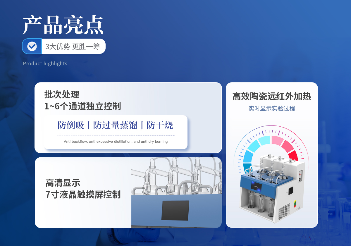 智能一体化蒸馏仪采用智能模块化设计:方法自定义设置保存/读取、开机自动调取使用,冷凝单元特殊定制蛇形冷凝管、智能终点控制防过量蒸馏、防倒吸保护,防干烧保护、实现了智能操作简单、自动蒸馏、美观实用、节能降耗、节省人工的同时为用户做样提**率节约人员成本开销。