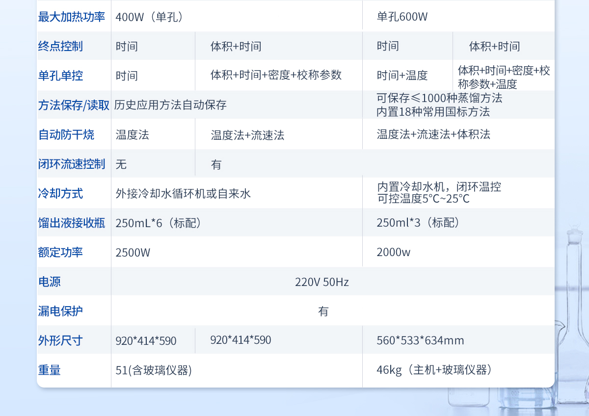 | 方法保存/读取 | 历史应用方法自动保存,自动加载 | 可保存≤1000种蒸馏方法,内置18种常用国标方法 | |