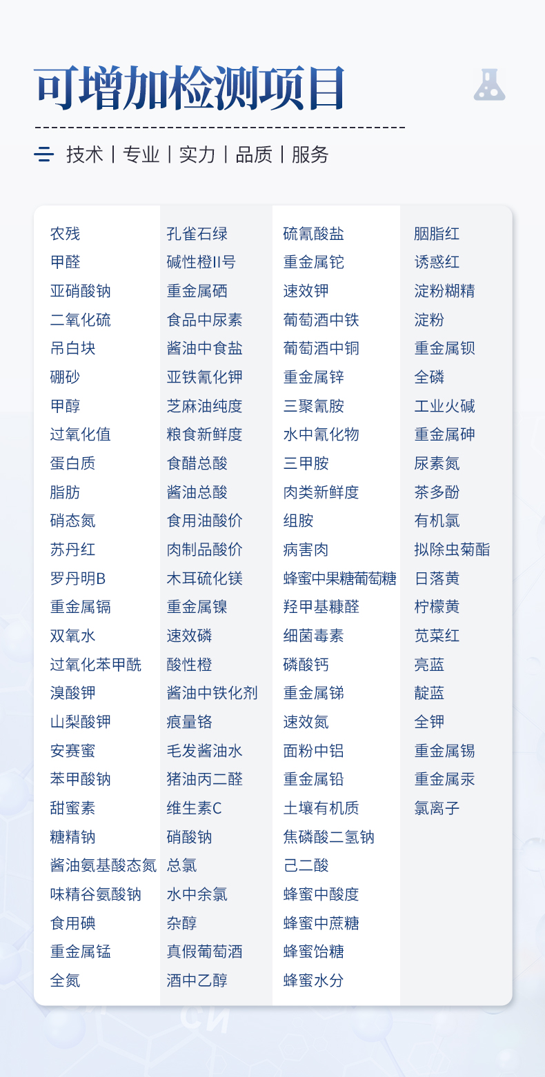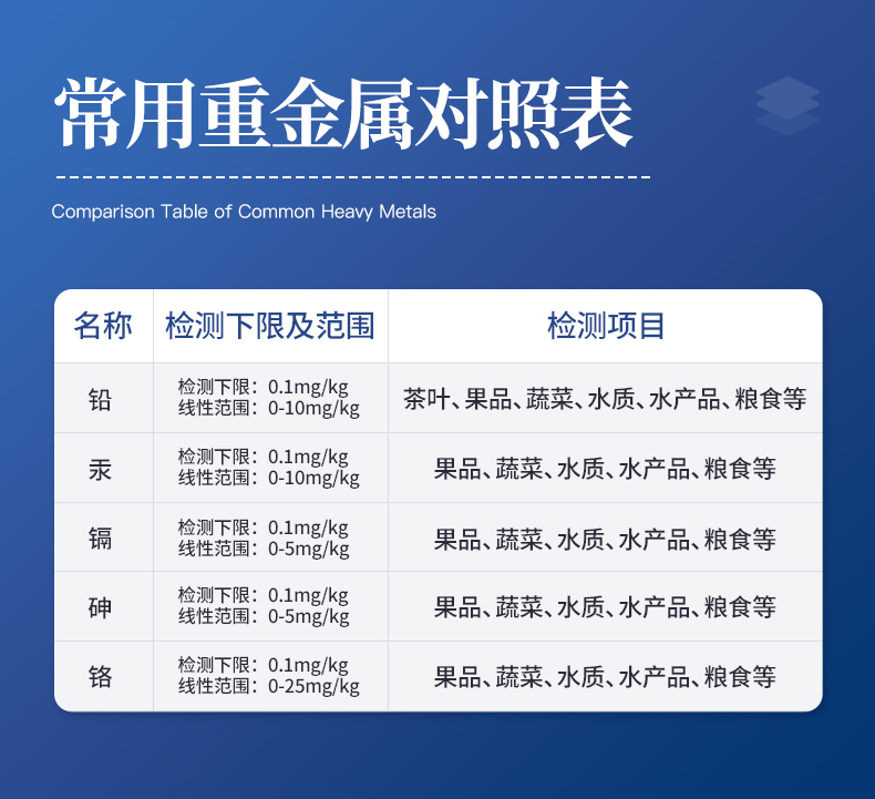 重金属检测仪可广泛应用于大米、粮谷、果品、蔬菜、药材、水质、水产品中重金属铅、镉、六价铬、汞、砷、铁、镍、铝的快速检测,检测项目可根据客户的需求定制。