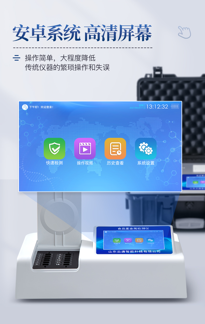 | ◆ 该仪器通过光电子技术对反应生成物的反射率进行分析测试,定量或定性分析样品中待测物的含量。 | ◆ 安卓智能操作系统,7英寸高灵敏真彩触摸屏,更加**和人性化操作界面,读数直观、简单。 | ◆ 仪器具有4G无线联网、wifi联网上传、GPRS无线远传功能,快速上传数据。 | ◆ 一体化便携式快检设备,满足现场及流动检测使用需求,能够在同一软件下实现所有重金属检测项目的检测,并可通过同一窗口直观显示检测结果。 | ◆ 具有多个食品安全检测项目,开放平台,可以增减检测项目。 | 检测通道:12检测通道,可以同时测试多个样品,每个样品由程序控制分别独立工作,不会互相干扰。 | ◆ 高速热敏打印机,实时打印检测结果。内置大容量电池,便于现场执法检测。 | ◆ 内置强大的数据库,可在仪器上直接选择样品名称、检测指标、送检单位等信息,也可在仪器上直接编辑录入样品名称、检测指标、送检单位等信息并保存进样品数据库。 | ◆ 机身储存上万条检测结果,也可以导出储存,另配备USB接口,方便U盘快速拷贝数据。 | ◆ 支持Wifi网络,数据可局域网和互联网数据上传,检测结果直接传至食品安全监管平台。进行区域食品安全监管及大数据分析处理,检测区域食品安全长短期动态,达到食品安全问题预估、预警 |