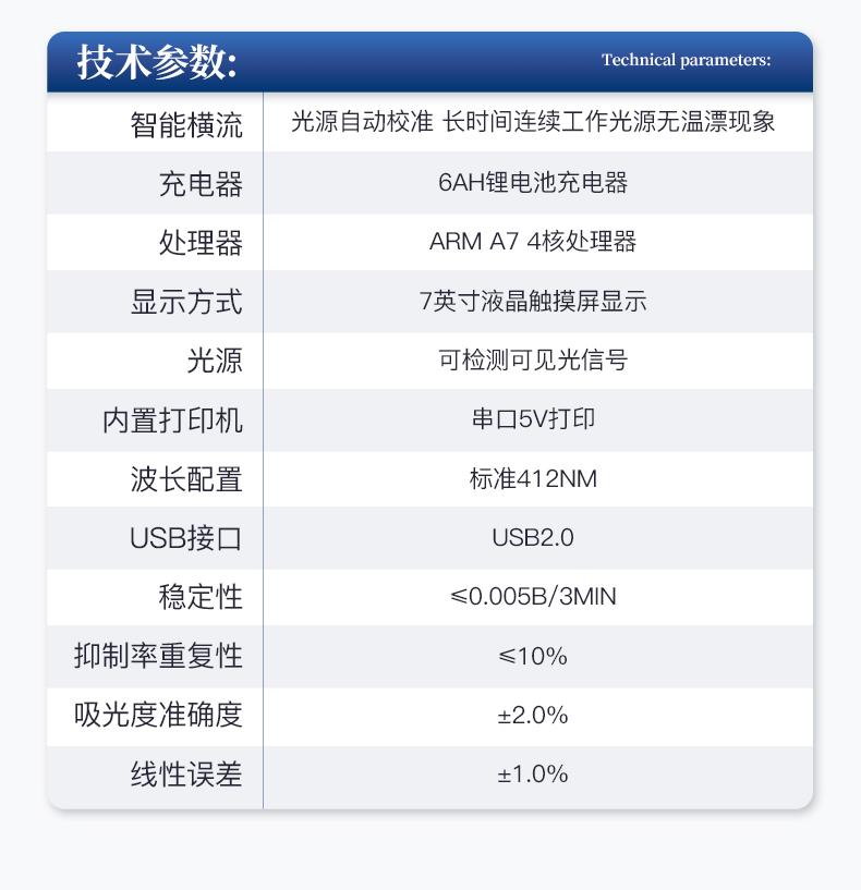 | ◆ ◆具有可见光光源,可检测可见光信号,检测值0~30000。 | ◆ ◆主控芯片采用ARM A7 4核处理器,主频1.88Ghz,运转速度更快速,稳定性更强。 | ◆ ◆以模拟反射率的标准片为50%附近时为代表,精密度CV值≤0.8%。 | ◆ ◆交直流两用,交流(220±22V)~50Hz±1Hz,直流12V供电,可连接车载电源 | ◆ ◆便于现场携带操作,主机重量不大于3kg。 | ◆ ◆多波长冷光源,并且所有检测项目可实现所有通道同时检测。 | ◆ ◆光源亮度自动调节与校准 | ◆ ◆脉冲式恒流驱动,避免连续发光引起光衰和温漂。 | ◆ ◆内置*新国家限量标准,可继续更新。 | ◆ ◆可设置密码登录 | ◆ ◆不间断进样,连续检测 | ◆ ◆样本编号自动累加。 | ◆ ◆检测项目可扩充。 | ◆ ◆检测结果为Excel表格,连接电脑即可拷贝。 | ◆ ◆检测结果存储容量20万条 | ◆ ◆高速热敏打印机,检测完成可自动打印检测报告。 | ◆ ◆标准USB接口,免驱动安装。 | ◆ ◆固件可升级 | ◆重复性:±0.1%(A) | ◆重复抑制率:≤10% | ◆吸光度准确度:±2.0% | ◆稳定性:≤0.003A/3min | ◆线性误差:±1.0% | ◆尺寸:360X300X125(mm) | ◆仪器包装尺寸:510*390*375mm | ◆包装重量:8.5kg |