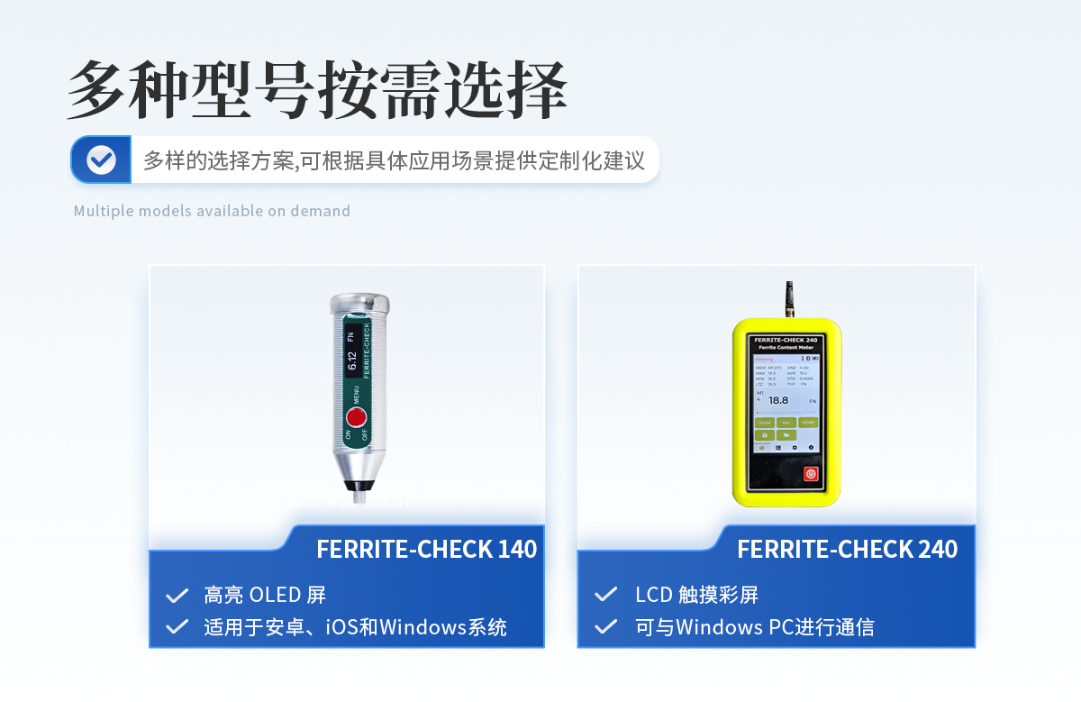 FERRITE-CHECK 240铁素体含量检测仪采用分体式的设计,使用方便,仪器符合Basel标准DIN EN ISO 8249,使用磁感应法测量奥氏体钢和双相钢中的铁素体含量。 全新测头