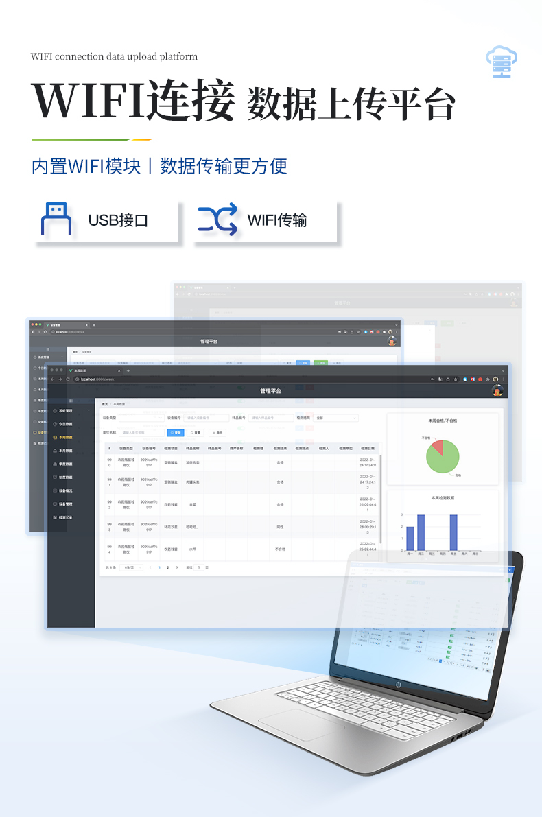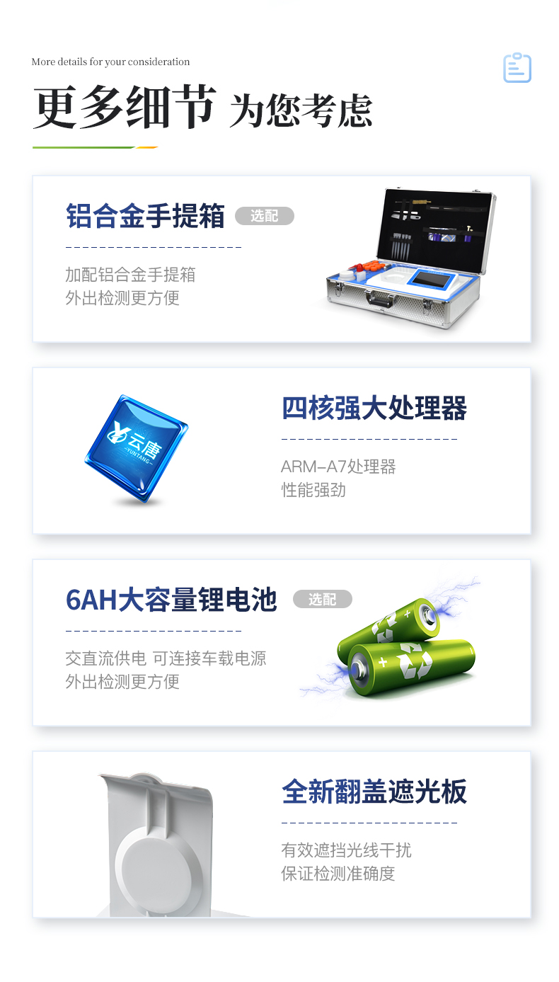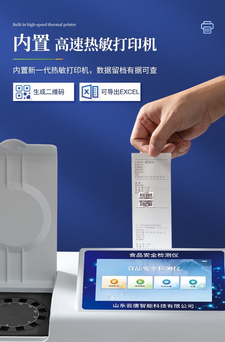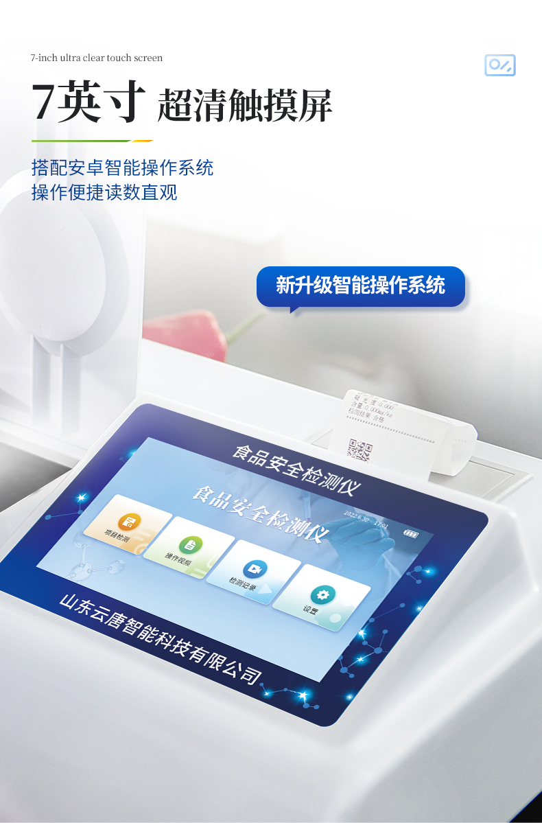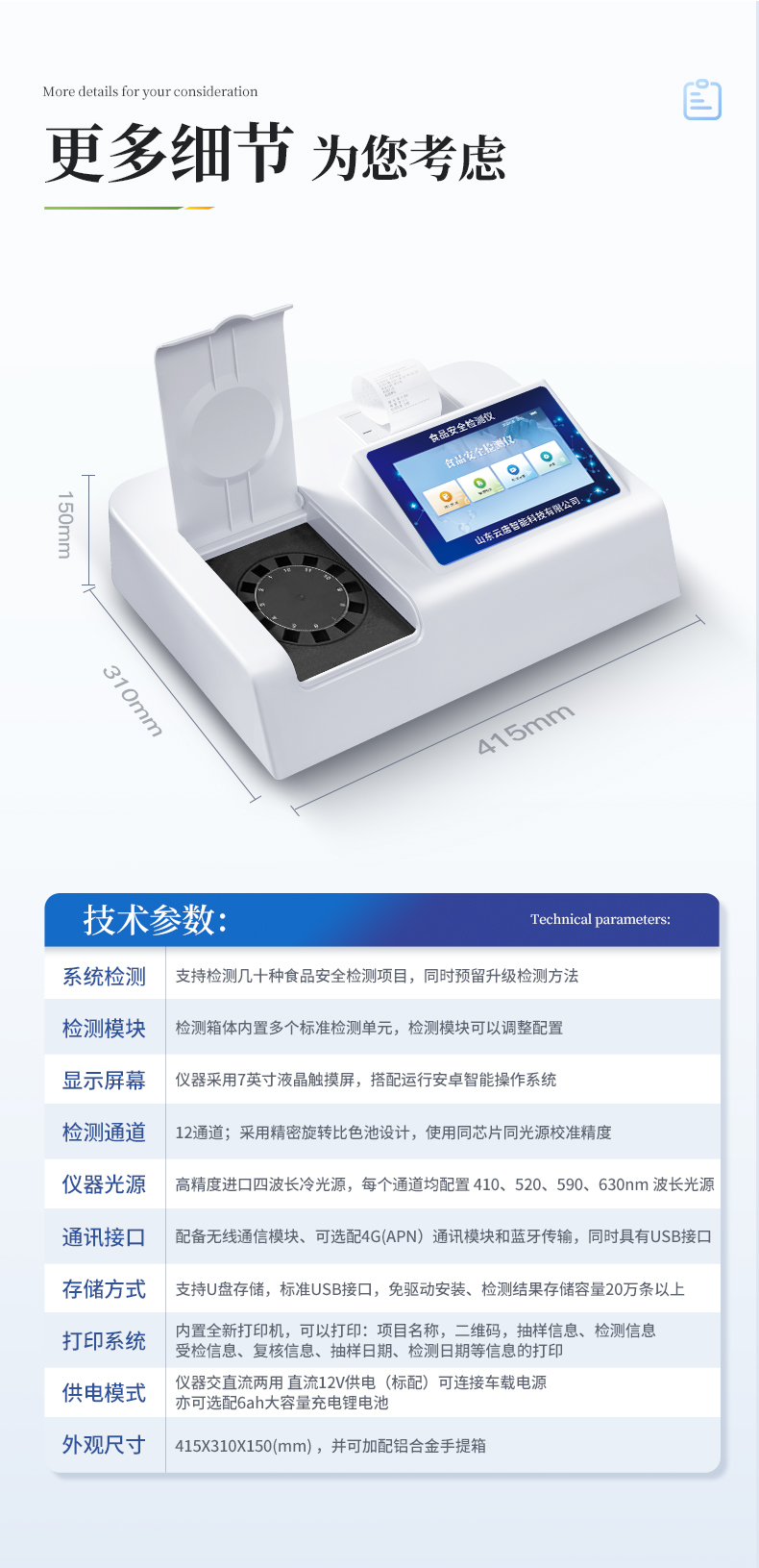| ◆ 仪器采用台式一体化系统检测技术,将分光光度模块、数字化管理模块、无线通讯模块高度集成于一体,支持检测几十种食品安全检测项目,同时预留升级检测方法。 | 显示屏幕:仪器采用7英寸液晶触摸屏,搭配运行安卓智能操作系统,主控芯片采用ARM Cortex-A7,RK3288/4核处理器,主频1.88Ghz,操作方便,性能更强。 | 检测通道:12通道;采用精密旋转比色池设计,使用同芯片同光源校准精度,解决不同光源之间的误差值,更加准确**。 | 仪器光源:高精度进口四波长冷光源,每个通道均配置 410、520、590、630nm 波长光源,标配**的光路切换装置,光路切换功能可实现64波长,并且所有检测项目可实现所有通道同时检测。 | 通讯接口:配备无线通信模块、可选配4G(APN)通讯模块和蓝牙传输,同时具有USB接口,可以多方式实现数据保存及数据传输。 | 存储方式:支持U盘存储,标准USB接口,免驱动安装。检测结果存储容量20万条以上,可生成Excel表格进行拷贝,并具有登录保护功能。 | ◆ 智能化操作系统: | 1、操作系统:仪器可在同一检测界面自动对应相关检测通道,一次性选择1-12个样品名称,无需退出界面,节省操作时间。并可以对每个通道属性和样品信息单独进行编辑,例如送检单位、人员,检测人员等,打印时勾选打印显示。 | 2、限量规判系统:具有限量查询、添加物质合规判定系统。检测出结果后,系统自动调用系统数据库中相关国标进行比对判定,客观显示结果是否合格。 | 3、数据监管系统:同步对接监管平台,数据可局域网和互联网数据上传,检测结果可选择直接传至食品安全监管平台。进行区域食品安全监管及大数据分析处理与数据统计,检测区域食品安全长短期动态,达到食品安全问题预估、预警。 | 4、打印系统:内置全新打印机,可以打印:项目名称,二维码,抽样信息、检测信息,受检信息、复核信息、抽样日期、检测日期等信息的打印。 | 供电模式:仪器交直流两用,直流12V供电(标配),可连接车载电源,亦可选配6ah大容量充电锂电池,电量可实时显示,方便户外流动测试。 | ◆ 仪器具有重新校准、锁定、恢复出厂设置功能, | 外观尺寸:415X310X150(mm) ,并可加配铝合金手提箱 |