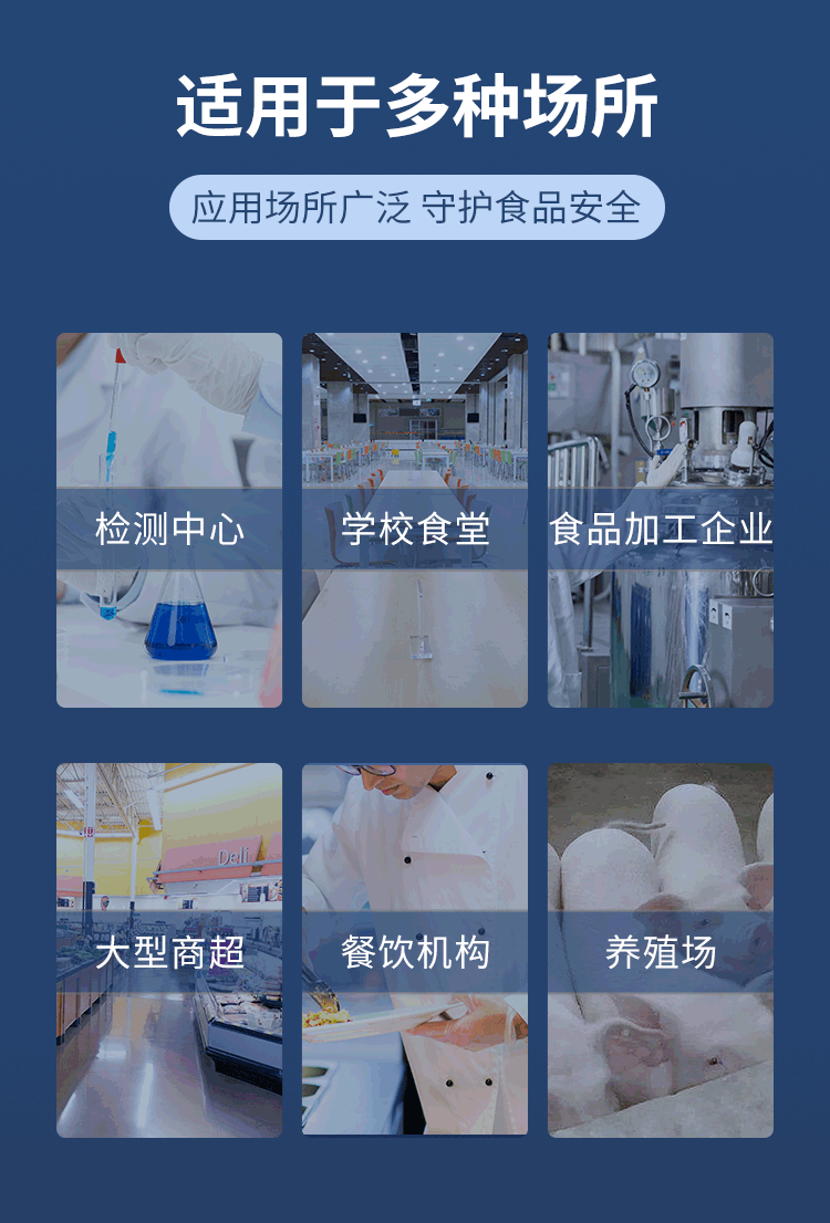 该食品安全检测仪为集成化食品安全快速检测分析设备,目前已于食药监局、卫生部门、高教院校、科研院所、农业部门、养殖场、屠宰场、食品肉产品深加工企业及检验检疫部门等单位广泛使用。
