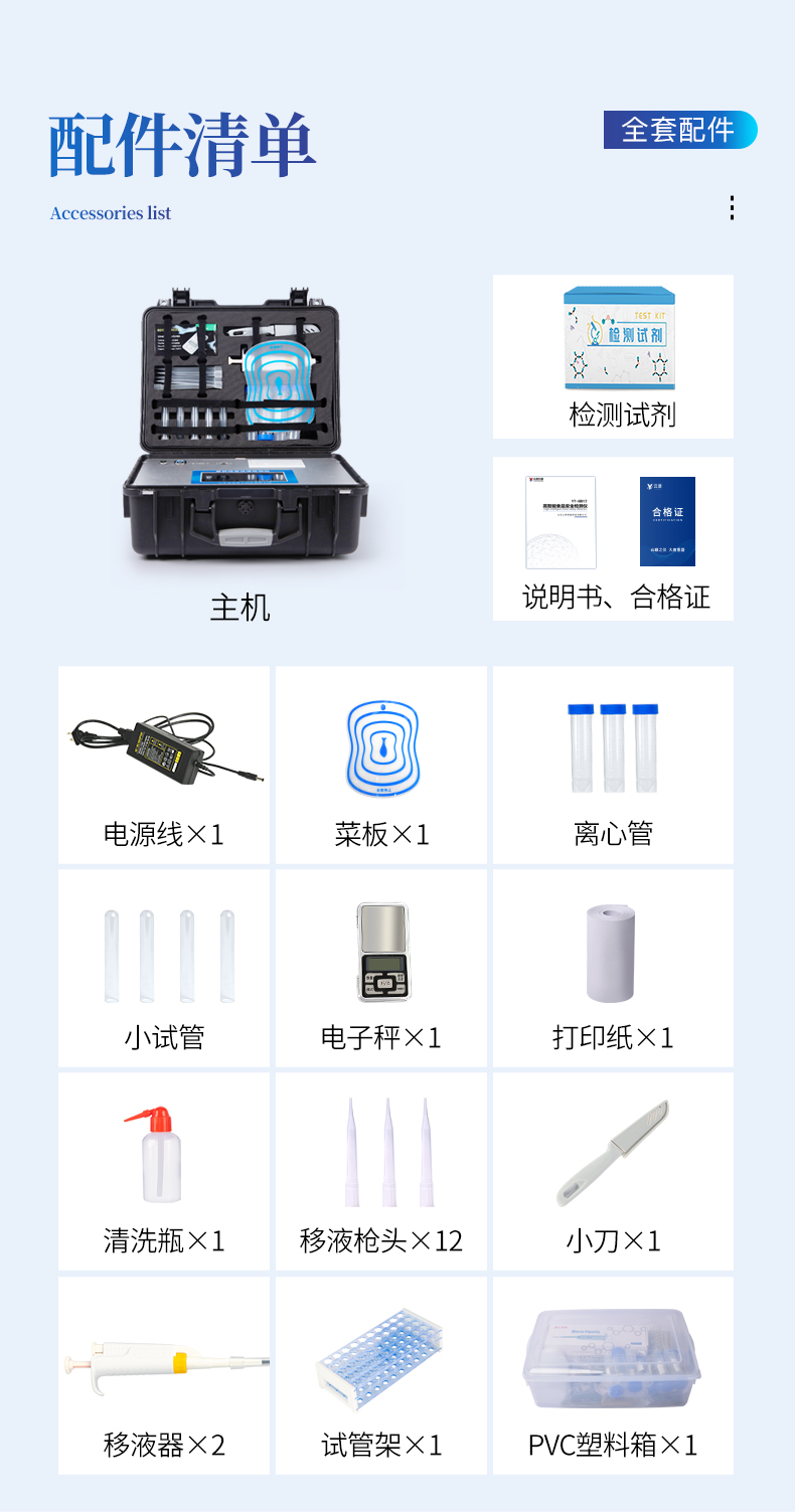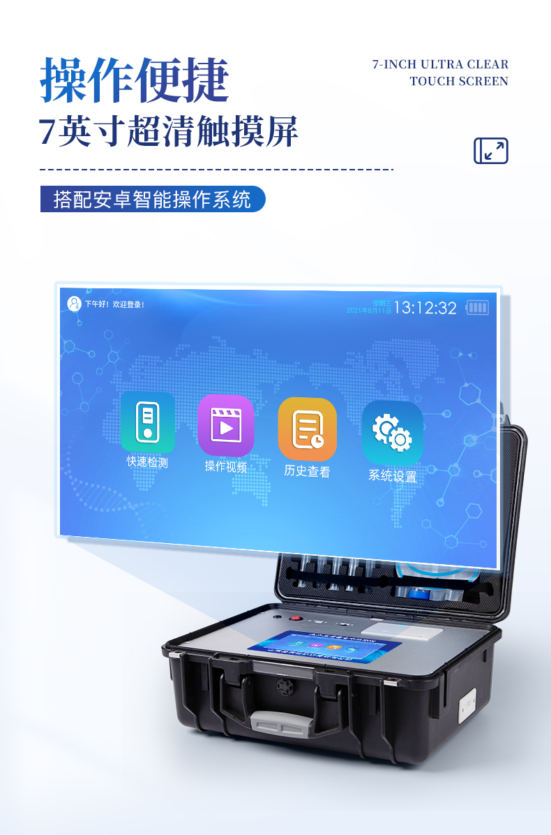 | ◆ 一体化便携式快检设备,机箱采用工业级ABS工程塑料箱,方便携带,稳固耐用,满足现场及流动检测使用需求。 | ◆ 安卓智能操作系统,采用更加**和人性化操作,主控采用多核处理器,运转速度更快速,稳定性更强。 | ◆ 自动判断样品是否合格,检测结果更加直观,可以连续测试多个样品,循环检测,即放即检。 | ◆ 仪器内置强大的数据库,具有多种类样品名称菜单库,分类管理,可灵活选择检测样品、检测指标、检测单位等信息,并可按需编辑录入样品名称,检测指标、送检单位等信息,添加或删除名称,并保存进样品数据库。 | ◆ 仪器具有wifi联网功能,4G信号GPRS远传功能,可插手机卡实现数据远传,可将数据快速上传电脑和服务器监管平台,进行数据管理与统计。 | 智能化程度高,仪器具有自检功能:具有开机自检和调零功能,具有自动检测重复性功能。 | ◆ 新一代高速热敏打印机,检测完成可自动打印检测报告和二维码。打印报告包含被测物质、合格不合格、检测单位、被检查单位、检验员、检测时间。 | ◆ 仪器带有监管平台,数据可局域网和互联网数据上传,检测结果直接传至食品安全监管平台。进行区域食品安全监管及大数据分析处理与数据统计,检测区域食品安全长短期动态,达到食品安全问题预估、预警。 | ◆ 能够在同一软件下实现所有检测项目的检测,并可通过同一窗口直观显示检测结果。 | 免疫层析检测模块检测方式:轨道式自动传输扫描,检测完成后自动退出检测卡。 | ◆ CT线自动识别,无需手动调整。 | ◆ 样品处理简单省力,整体操作快速、安全、便捷。 | ◆ 高灵敏度,高检测精度,高重复性精度,扫描式高精度光学传感器。 | ◆ 仪器具有自身保护功能,可设置用户名及密码,防止非工作人员操作等。 | ◆ 仪器具有重新校准、锁定、恢复出厂设置功能。 | ◆ 支持U盘存储。结果判定线可修改,对照值标定值可保存,断电不丢失数据。 | ◆ 兼容市场上所有的检测卡,使用耗材不受限制,极大增强用户使用体验。 |