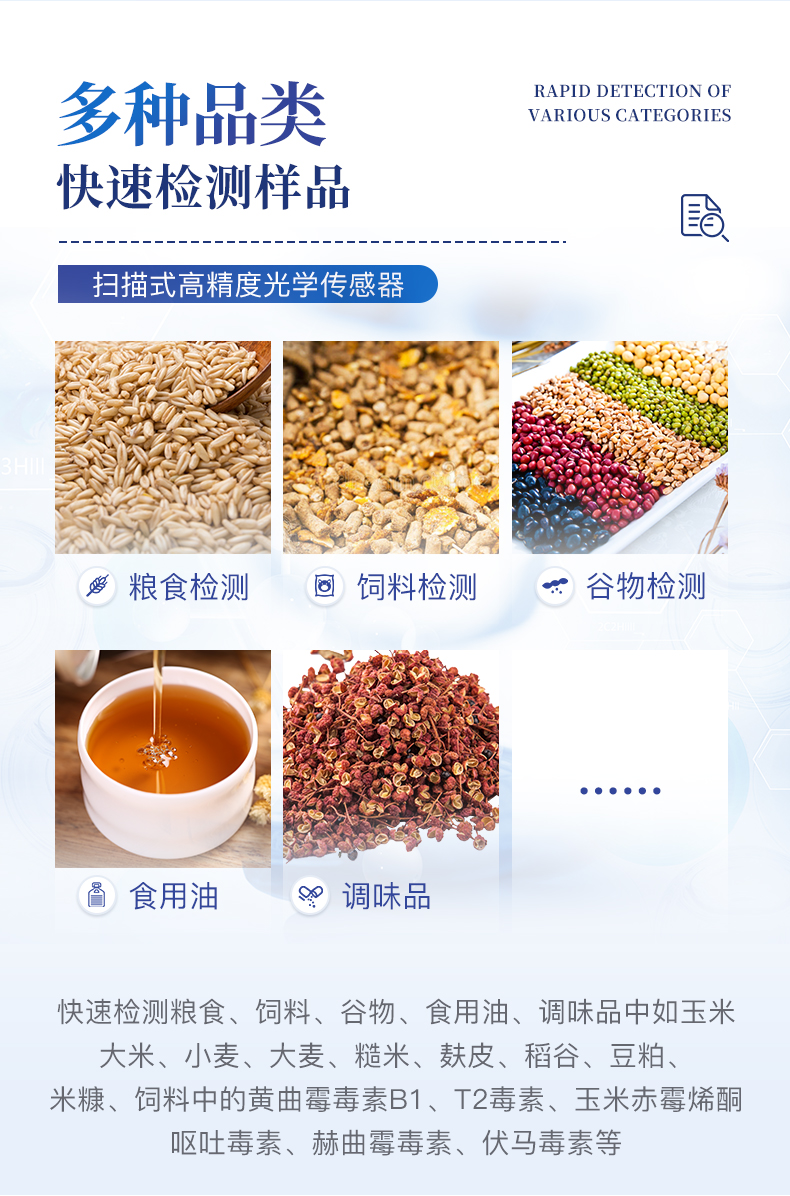 真菌毒素检测仪应用竞争抑制免疫层析的技术原理,通过就是通过待检测物与抗体结合的方法,分析待检样品中真菌毒素残留。可快速检测粮食、饲料、谷物、食用油、调味品中如玉米、大米、小麦、大麦、糙米、麸皮、稻谷、豆粕、米糠、饲料中的黄曲霉毒素B1、玉米赤霉烯酮、呕吐毒素、T2毒素、赭曲霉毒素、伏马毒素。