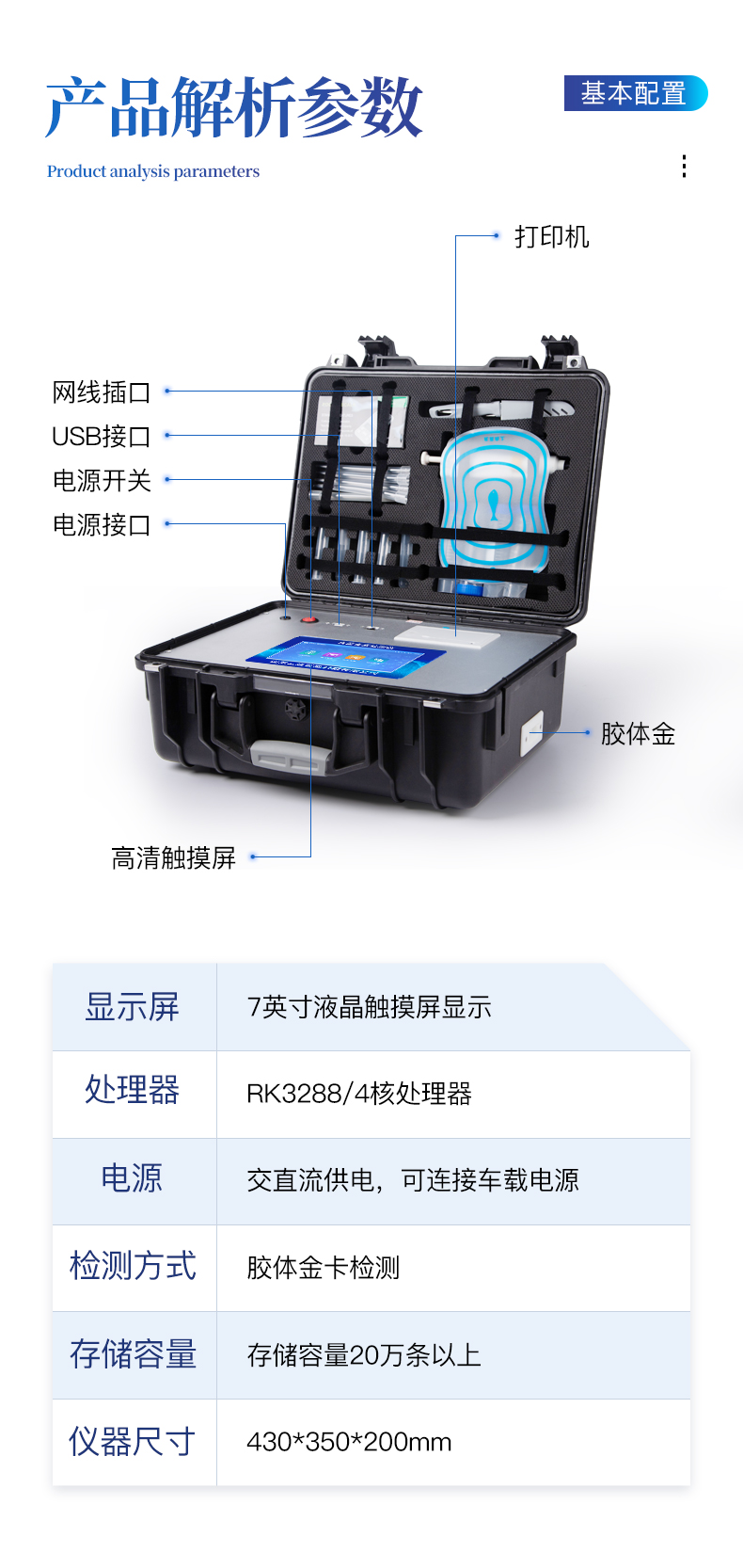 | ◆ 主控芯片采用ARM Cortex-A7,RK3288/4核处理器,主频1.88Ghz,运转速度更快速,稳定性更强。 | 显示方式:7英寸液晶触摸屏显示,人性化中文操作界面,读数直观、简单。 | ◆ 交直流两用,直流12V供电,可连接车载电源,可配6ah大容量充电锂电池,方便户外流动测试。 | ◆ 光源亮度自动调节与校准 | ◆ 智能恒流稳压,光强自动校准,长时间连续工作光源无温漂现象。。 | ◆ 内置新国家限量标准,与所测结果进行现场比对,并持续更新标准。 | ◆ 不间断进样,连续检测 | ◆ 样本编号自动累加。 | ◆ 检测项目可扩充。 | ◆ 检测结果可批量打印,批量上传。 | ◆ 检测结果为Excel表格,连接电脑即可拷贝。 | ◆ 检测结果存储容量20万条 | ◆ 标准USB接口,免驱动安装。 | ◆ 固件可升级 |