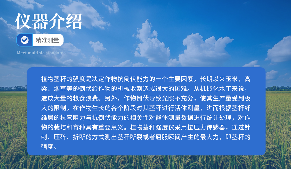 植物茎秆的强度是决定作物抗倒伏能力的一个主要因素,长期以来玉米,高梁、烟草等的倒伏给作物的机械收割造成很大的困难。从机械化水平来说,造成大量的粮食浪费。另外,作物倒伏导致光照不充分,使其生产量受到极大的限制。在作物生长的各个阶段对其茎秆进行活体测量,进而根据茎杆纤维层的抗弯阻力与抗倒伏能力的相关性对群体测量数据进行统计处理,对作物的栽培和育种具有重要意义。植物茎秆强度仪采用拉压力传感器,通过针刺、压碎、折断的方式测出茎秆断裂或者屈服瞬间产生的**力,即茎秆的强度