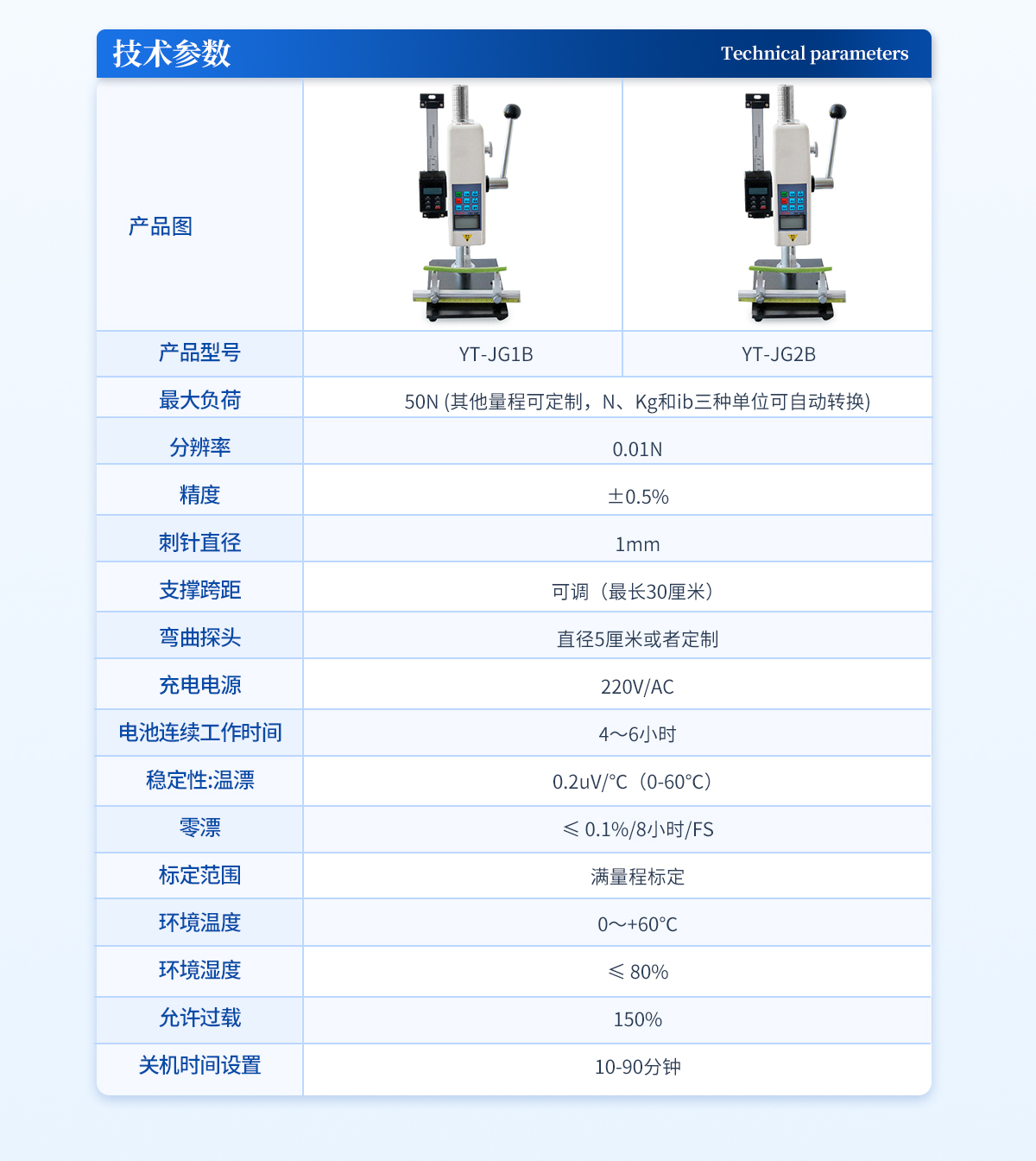 | **负荷:500N (其他量程可定制,N、Kg和ib三种单位可自动转换) | 分辨率:0.1N | 精度:±0.5%; | 刺针直径:1mm | 支撑跨距:可调(*长30厘米) | 弯曲探头:直径5厘米或者定制 | 充电电源:220V/AC; | 电池连续工作时间:4~6小时; | 稳定性:温漂:0.2uV/℃(0-60℃); | 零漂:≤ 0.1%/8小时/FS; | 标定范围:满量程标定; | 环境温度:0~+60℃; | 环境湿度:≤ 80%; | 允许过载:150%; | 关机时间设置:10-90分钟。 |