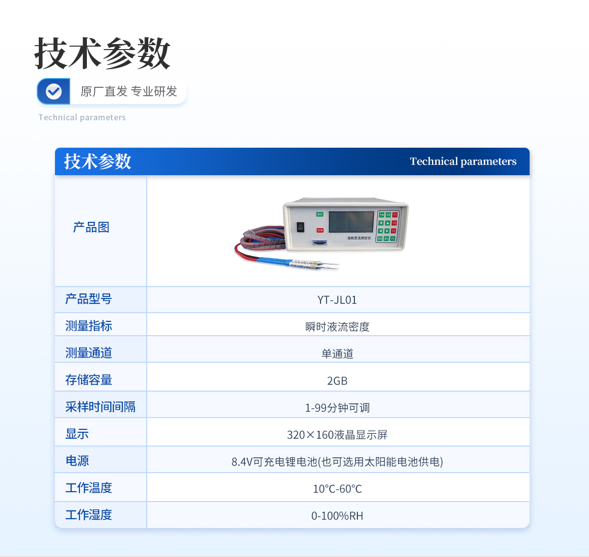 | 测量指标:瞬时液流密度 | 测量通道:单通道 | 存储容量:2GB | 采样时间间隔:1-99分钟可调 | 显示:320×160液晶显示屏 | 电源:8.4V可充电锂电池(也可选用太阳能电池供电) | 工作温度:10℃-60℃ | 工作湿度:0-100%RH |